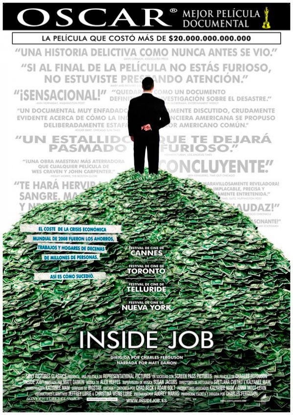 Título: Inside Job Género: Documental Año de estreno: 2011 Director: Charles Ferguson Reparto: Barney Frank, Charles Morris, Daniel Alpert, Dominique